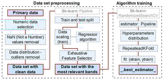 A Pipeline was created that includes three phases. In the first phase, the data are divided randomly, identifying the predictor variables and the response variable. In this way, 80% of the data was selected for training and 20% for validation. For each of the ML algorithms, in the second phase, the training data were scaled and in the third phase, by implementing the Exhaustive Feature Selector class from the mlxtend library, the spectral bands of Landsat-8 and Sentinel-2 were selected as most relevant input variables. All possible combinations were sampled and evaluated with a cross-validation of 8 folds for Landsat-8 and 12 folds for Sentinel-2, matching numbers according to the number of bands analyzed [52].