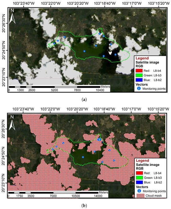 Application of cloud masks to Landsat-8 images of Lake Cajititlán. (a) Original image with cloudiness. (b) Image with cloud mask.