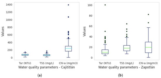 Distribution of the data set of water quality parameters for (a) Cajititlán, and (b) Zapotlán.