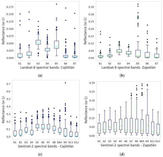 Distribution of radiometric data (a) Landsat-8 Cajititlán, and (b) Landsat-8 Zapotlán, (c) Sentinel-2 Cajititlán and (d) Sentinel-2 Zapotlán.