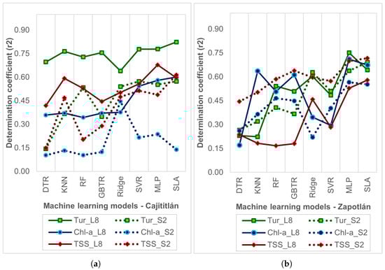Assessment of the predictive capabilities of ML models for (a) Lake Cajititlán and (b) Lake Zapotlán. The models are identified by distinct symbols and colors, with green denoting turbidity, red representing TSS, and blue signifying Chl-a. Furthermore, solid lines correspond to models developed using Landsat-8 data (L8), while dashed lines correspond to models utilizing Sentinel-2 data (S2).