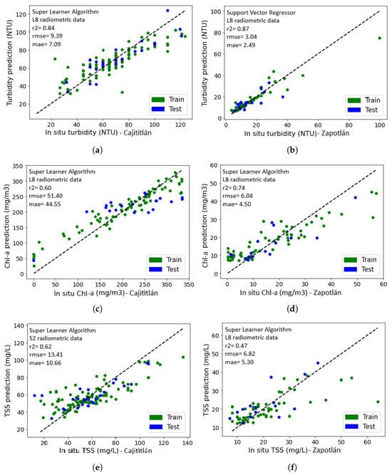 The best performances for the modeling were identified by comparing the r2 values. In each of the lakes, the best results for the prediction of TSS, turbidity and Chl-a were found based on the ML algorithms and radiometric data evaluated. Figure 7a shows the results for Lake Cajititlán. It is observed that the Landsat-8 radiometric data were the most appropriate input variables to develop the ML predictive models. For example, for turbidity r2 values between 0.64 and 0.82 were obtained, for TSS r2 were between 0.42 and 0.68, and for Chl-a r2 were between 0.34 and 0.60. Likewise, the models that presented the best performance were the MLP with r2 between 0.58 and 0.78 and SLA with r2 between 0.60 and 0.82, while the lowest performance was reported by the DTR with r2 between 0.36 and 0.70. In the case of the models developed with Sentinel-2 radiometric data for turbidity, r2 values between 0.14 and 0.57 were obtained, for TSS they reached a range of r2 between 0.15 and 0.61, and for Chl-a the r2 comprised results between 0.10 and 0.45. For this case, the most acceptable performances were achieved with the Ridge models with r2 between 0.47 and 0.54, SLA with r2 between 0.14 and 0.61, and MLP with r2 between 0.24 and 0.55.