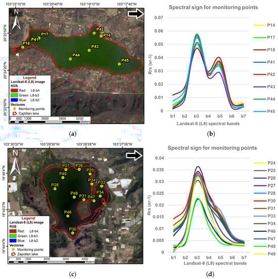 Landsat-8 image in natural color for lakes (a) Cajititlán and (c) Zapotlán. Spectral signal for the monitoring points managed by the RNMC for (b) Cajititlán and (d) Zapotlán.
