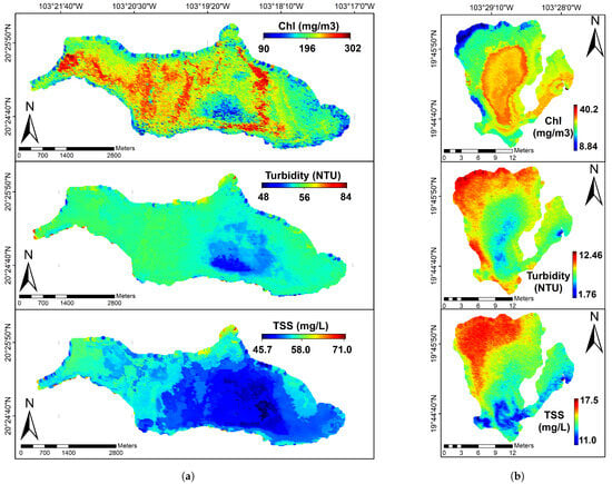Spatial distribution maps for the estimation of Chl-a, TSS and turbidity with radiometric data from Landsat-8 10 November 2022). Results for Lake Cajititlán in the left column (a) and Zapotlán in the right column (b).