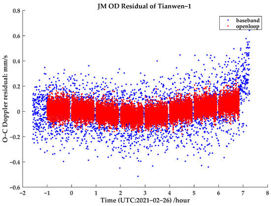 The determination of Tianwen-1’s orbit was supported by both Doppler and Very Long Baseline Interferometry (VLBI) tracking data captured at various CDSN stations. In Figure 5, the orbital Doppler residuals show the velocity precision of a common orbit determination for Tianwen-1 from Earth ground tracking station JM on 6 February 2021, which is about 0.1 mm/s [24]. Open-loop (red point) is the novel Doppler extractor, and baseband (blue point) is the classical Doppler extractor equipped on a ground station. It is shown in Figure 5 that the precision of the open-loop result is higher than that of the baseband. The open-loop receiver was used for our experiment and is also mentioned in Section 4.1.2.