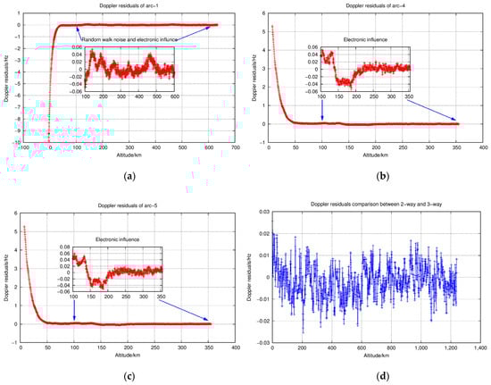 Distribution of the Doppler residuals with the occultation height: (a) is for the arc-1(ingress) with one-way observation; (b) is for the arc-4(egress) with two-way observation; (c) is for the arc-5(egress) with three-way observation; and (d) is the difference in the arc-4 and arc-5 Doppler residuals. The tracking span is the same for arc-4 and arc-5. Two sessions used two-way and three-way observation modes, respectively, and the Earth media correction was conducted.