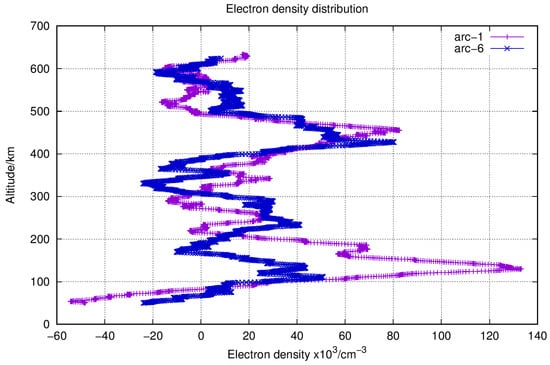 Analyzing the electron density profiles in Figure 8, there are peaks below 200 km in arc-1 and arc-6 observations. However, the electronic density is supposed to decrease rapidly above the M2 layer (above 230 km), and a perplexing peak area was observed at an altitude of 450 km in Figure 8. Consequently, the retrieved electron density profiles are not reasonable for either arc-1 or arc-6 observations.