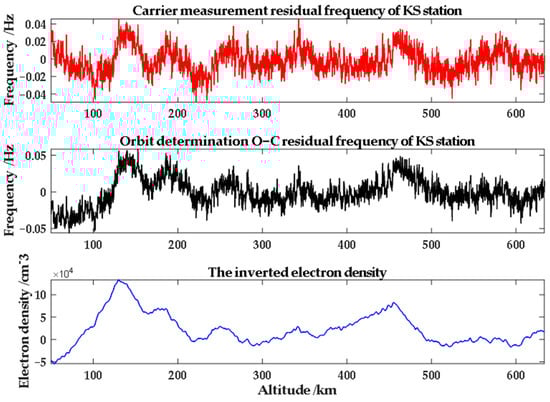 The result of comparative analysis of arc-1 on March 22 in 2022: (1) the fitting residual frequency of carrier measurement at KS station; (2) one-way orbit determination of O-C residual frequency at KS station; and (3) the inverted electron density result (x-axis is the altitude of corresponding occultation points).