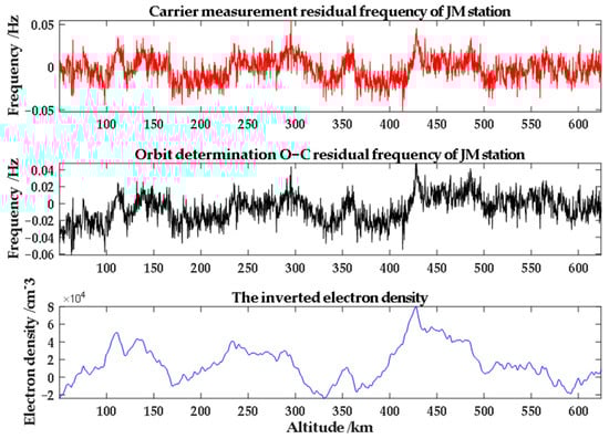 The result of comparative analysis of arc-6 on March 25 in 2022: (1) the fitting residual frequency of one-way carrier measurement at JM station; (2) the orbit determination O-C residual frequency at JM station; and (3) the inverted electron density result (x-axis is the altitude of corresponding occultation points).
