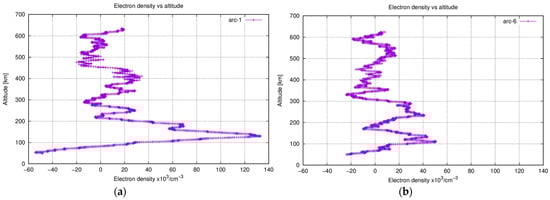 Profiles of the ionospheric electron density with the occultation height: (a) is arc-1 with one-way observation mode and (b) is arc-6 with one-way observation mode.