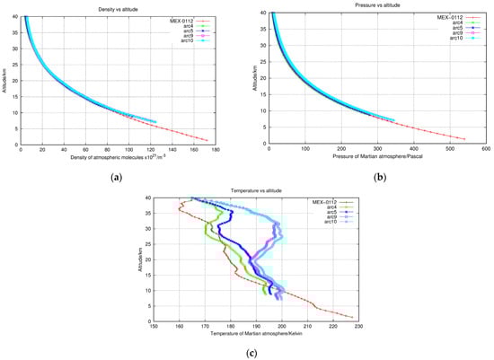 (a) The atmospheric molecule density profiles of MEX-0112 and arc-4,5,9,10; (b) the atmospheric pressure profiles of MEX-0112 and arc-4,5,9,10; and (c) the atmospheric temperature profiles of MEX-0112 and arc-4,5,9,10.
