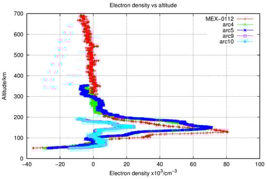 All the electronic density profiles in Figure 13 illustrate the distinct M1 and M2 layers, showing the electronic density’s rapid decrease beyond the M2 layer. With altitude as the variable, the electronic density fluctuations in arc-4,5 and arc-9,10 exhibited consistency with the observations made by MEX-0112. This indicates that our observations align with established trends in the Martian ionosphere.