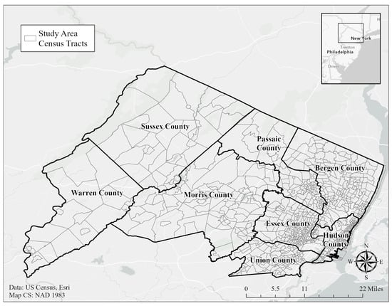 This study focuses on eight of New Jersey’s northern counties, ranging from Sussex County in the northwest to Union County in the southeast (Figure 1). This region was selected due to its wide range of urban development, sociodemographic makeup, and environmental characteristics, culminating in a diverse environmental justice landscape. As the closest region to neighboring New York City, New Jersey ranks as one of the most densely populated states in the US, with a high rate of ethnic and religious diversity to match [45]. The state’s transition away from industrial production decades ago left behind a legacy of environmental hazards in the form of brownfields, landfills, and contaminated waterways, the likes of which are still being rehabilitated today [46]. These burdens are particularly prevalent in the northern part of the state and, when paired with the echoes of discriminatory policies impacting resource distribution, result in an increased awareness of the persistence of environmental racism and environmental injustice. In fact, the state of New Jersey has openly acknowledged environmental injustice and has begun taking steps toward addressing it, exemplified by legislation passed to mitigate the development of construction facilities in overburdened communities [47] and address existing pollutants focused in low-income and communities of color [48]. This growing public interest in environmental justice coupled with the state’s history and high levels of data availability makes New Jersey an ideal location for conducting novel environmental justice research.
