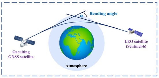 GNSS RO is an active remote sensing technique for retrieving atmospheric parameters. The transmitted GNSS signals are refracted while passing through the atmosphere before being received by Low-Earth Orbit (LEO) receiver satellites. From the precise positions and velocities of the GNSS satellites and LEO satellite, the bending angle (BA) is estimated from the excess phase [29]. Above 25 km, the BA is estimated using the geometric optics method, while below 25 km, the wave optics method is used to determine the BA during processing in the Radio Occultation Processing Package version 9 (ROPP V.9) [30,31,32].