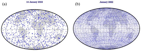Distribution of GNSS RO events from Sentinel-6 on 14 January 2022 (a) and in January 2022 (b).