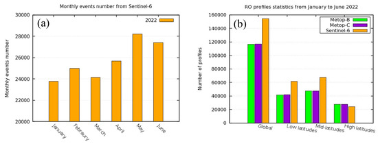 Monthly RO profiles numbers from Sentinel-6 from January to June 2022 (a) and RO profiles statistics from MetOp-B, MetOp-C, and S6 for the global and latitudinal data sets from January to June 2022 (b).