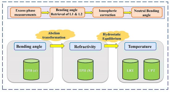 The BA contains atmospheric information through a ray path. The BA is transformed into refractivity (N) using the inverse Abelian transformation based on the assumption of spherical symmetry, i.e., refractivity only varies vertically and is locally homogeneous horizontally. The temperature profile was extracted from the N profile under the assumption of hydrostatic equilibrium [33,34]. The geometry of GNSS RO is depicted in Figure 1.