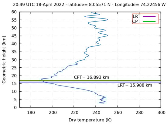 An example of a GNSS RO temperature profile at a specific location at night, indicated by the TPH computed from the LRT and CPT, is presented in Figure 5. As this graph illustrates, the CPT height was higher than the LRT height.