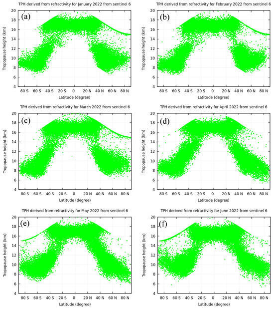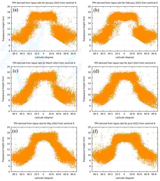 Figure 3a illustrates the monthly RO profile from S6 from January 2022 to June 2022. During this period, there were approximately 154,279 GNSS RO profiles. In this study, the GNSS RO data retrieved from S6 were downloaded from https://rom-saf.eumetsat.int/pub/ntc/profs/sentinel6/atm/ (accessed on 30 September 2022). Temperature, N, and BA profiles were obtained from the processing of the GNSS RO data to identify the TPH using different algorithms.