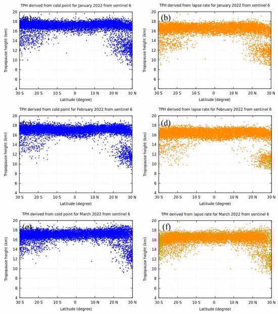 The distribution of the LRT height and latitude during the study period is shown in Figure 6. Figure 6 depicts that the LRT has its highest value at the equator and its lowest value at the poles. Additionally, Figure 6 also shows that the LRT height is dependent mainly on latitude and decreases with latitude in both the northern and southern hemispheres, which is consistent with the results published by Schmidt et al. [5]. As presented in Figure 6, there is a break between the upper and lower tropopauses around 20–30°N in January, February, and March. A similar asymmetry looks to be beginning to develop in the southern hemisphere in the June data. The LRT algorithm is globally applicable for identifying the TPH.