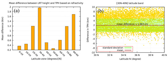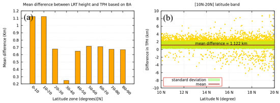 To analyze the difference between the LRT height and the TPH based on the BA, the latitude bands in the Northern Hemisphere were divided into nine zones, with each zone consisting of ten degrees. The MD and the standard deviation (STD) of the differences were estimated for each zone. As shown in Figure 12a, the largest MD was 1.12 km from the equator to 20°N and the largest MD between the LRT height and the TPH based on the BA is presented in Figure 12b. In general, in the latitude band of 30–40°N, the TPH based on BA exhibited the maximum variation as presented in Figure 12a.