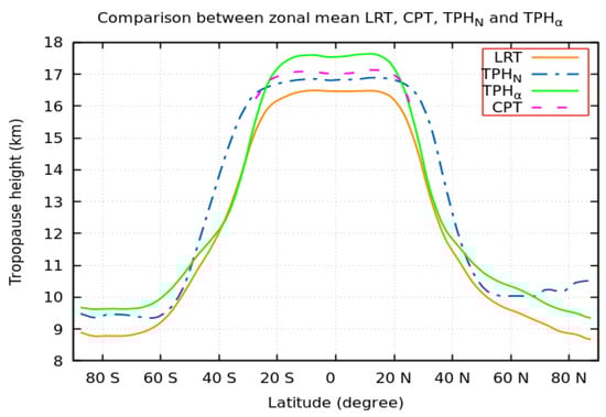 In general, as shown in the previous figure, the TPHα had the largest value followed by the TPHN, and the LRT had the lowest value of the TPH at and near the equator. The maximum TPH occurred in the equatorial region, whereas the minimum TPH occurred at the poles. In the equatorial region, the maximum TPH results from the TPHα (approximately 17.5 km), and at the poles, the minimum TPH results from the LRT (approximately 9 km) during the study period. Zhang et al. [24] found that the maximum TPH estimated from COSMIC data is found at the equator, which varies around 17 ± 0.5 km, and the minimum TPH is found at the North Pole, which fluctuates around 9.2 ± 1 km. Our results agree well with the results of Zhang et al. [24]. The previous figure shows that the slope of the TPH is steep in mid-latitude bands. For all the TPH methods, the strongest gradients were found between 20° and 40° in both hemispheres, while the TPH was constant between the equator and 20° in both hemispheres.