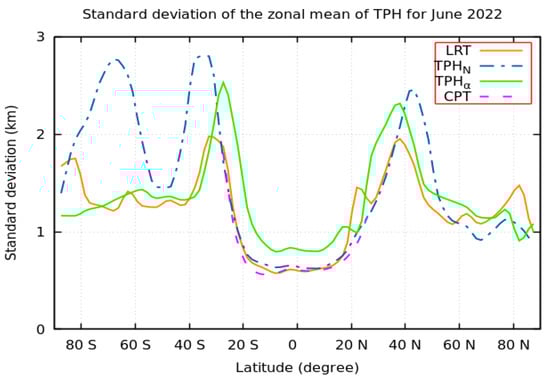 As an example, the STD of the zonal means for the different algorithms used for the identification of the TPH in June 2022 is presented in Figure 14. From Figure 14, it can be observed that the STD of the zonal mean is the lowest at the equator, increases with latitude until 40°, then decreases again. The STD of the zonal mean was generally symmetric about the equator. From Figure 14, it can be further seen that the CPT and LRT height provide the minimum STD, and the TPH based on N presents the maximum STD. Figure 14 clearly shows that, generally, the STD of the TPHα is higher than the STD of the LRT height, except at the poles, due to the fact that in the case of multiple tropopause transitions occurring in a profile, the bending angle transition at the upper layers is greater than at the lowest tropopause.
