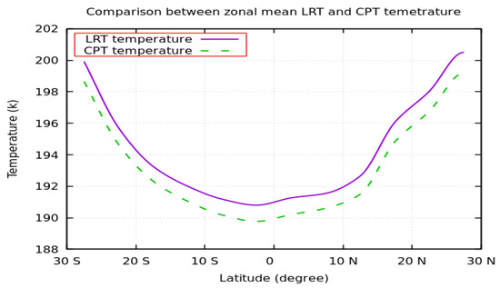 Figure 15 depicts the zonal mean for the LRT temperature and the CPT temperature during the study period in the low latitude band. As shown in Figure 15, the LRT temperature is higher than the CPT temperature with a mean difference of 1.1 k, and the correlation coefficient between them is 0.9998. Remarkably, both the LRT temperature and the CPT temperature increase with latitude, and there is symmetry in the northern and southern hemispheres for the LRT temperature and the CPT temperature. These results are in good agreement with the results published by Schmidt et al. [5]. A t-test was conducted at a 95% confidence interval to check if there was a significant difference between the LRT and CPT temperatures. The results show a p-value < 0.0001, which means that the difference between the LRT and CPT temperatures is significant.
