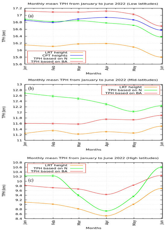 Next, the TPH monthly mean variations and standard error determined by different algorithms during the study period were discussed. The monthly mean and standard error of the LRT height, CPT height, TPH based on N, and TPH based on the BA in different latitude bands are presented in Figure 16. From Figure 16, we can see that the TPH is generally high at low latitudes and low at high latitudes. As observed in Figure 16a, at low latitudes (−30° to +30°), the LRT height is the lowest TPH, while the TPH based on the BA is the highest TPH based on the monthly mean. These results agree well with Xia et al. [39]. Figure 16a highlights that the CPT height is greater than the LRT height, and the TPH based on the BA is higher than the TPH based on N at low latitudes. As presented in Figure 16a, there is a little variation in the TPH based on N at low latitudes.