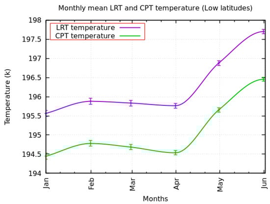 The monthly mean variation of LRT and CPT temperature with the standard error from January to June 2022 at the low latitude band.