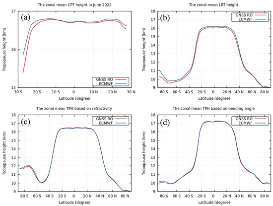 The equatorial region had the highest TPH, whereas the poles had the lowest TPH. At and near the equator, the TPHα is often the highest value, followed by the TPHN; the LRT height has the lowest value of TPH. The TPHα (approximately 17.5 km) produced the highest TPH in the equatorial region, and the LRT produced the lowest TPH near the poles (approximately 9 km) during the study period. The TPHs from different approaches estimated from ECMWF daily operational forecasts are in very good agreement with those estimated from GNSS RO, with a correlation coefficient of 0.999. The mean zonal difference between GNSS RO and ECMWF model was the lowest for the TPH based on the BA, and highest for the LRT height. In tropical, subtropical, and polar areas, GNSS RO underestimates the LRT height in comparison with the ECMWF model, whereas in tropical regions, the GNSS RO overestimates the TPHα.