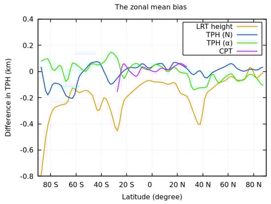 TPHs based on the CPT, N, and BA were compared with TPHs based on the LRT. In this comparison, the LRT height was used as the reference because it is applicable for all latitude ranges, while the CPT is spatially limited. To analyze the difference between the LRT and CPT in detail, the latitude bands were divided by ten degrees for the northern and southern hemispheres. The LRT and CPT heights were estimated from the temperature profiles obtained from the GNSS RO data processing.