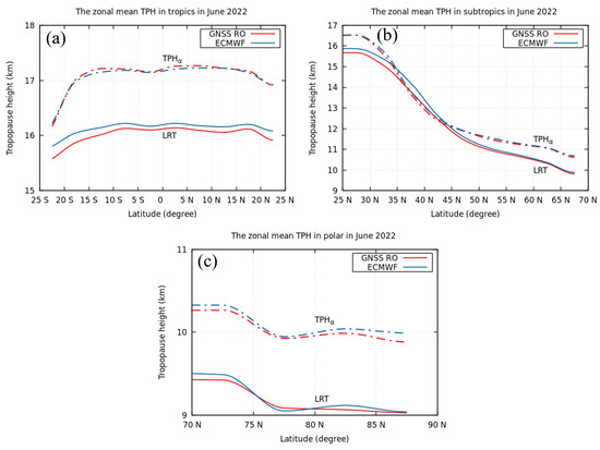 LRT height profiles in the tropical (a), subtropical (b), and polar regions (c) in the Northern Hemisphere, estimated from GNSS RO and the ECMWF model.