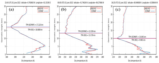 GNSS RO has a high vertical resolution with global coverage under all weather conditions [26,27]. GNSS is a promising remote sensing technique for studying the atmosphere compared to other traditional methods, such as radiosondes and forecast models. Despite the high vertical resolution of radiosonde measurements, they cannot achieve global coverage, and low vertical resolution is a problem with forecast models [13]. This shortcoming in radiosonde and forecast models can be replaced by GNSS RO. For TPH research, the GNSS-RO temperature profiles are particularly helpful because of their high vertical resolution of 100 m in the upper troposphere and lower stratosphere [28].