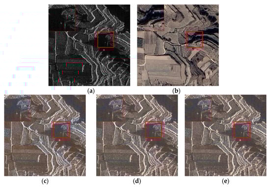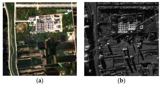 With the rapid development of different types of sensors that obtain information from the Earth, various remote sensing images have become available for users. Among them, optical images and synthetic aperture radar (SAR) images are two of the most commonly used data in remote sensing applications. SAR images have unique characteristic structure and texture information, making them adaptable for collection at any time without being affected by weather conditions. However, due to the special measurement method of SAR systems (i.e., side-looking imaging), the gray values of SAR images are different from the spectral reflectance of the Earth’s surface, which brings difficulties for the interpretation of SAR images in certain scenarios. As is shown in Figure 1, considering that optical images contain rich spectral information, they can directly reflect the colors and textural details of ground objects. Therefore, optical and SAR images are fused to obtain fusion results containing complementary information, thus enhancing the performance of subsequent remote sensing applications [1].