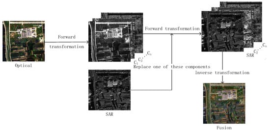 The fusion process of CS methods is shown in Figure 2. CS methods aim to obtain the final image fusion result by replacing a certain component of the positive transformation of the optical image with the SAR image and then applying the corresponding inverse transformation. In this way, the obtained image fusion result incorporates the spectral information from the optical image and the texture information from the SAR image. For instance, Chen et al. utilize the IHS transform to fuse hyperspectral and SAR images. The fusion results not only have a high spectral resolution but also contain the surface texture features of SAR images, which enhances the interpretation of urban surface features [24]. The conventional PCA method is improved by Yin and Jiang, and the fusion result demonstrates better performance in preserving both spatial and spectral contents [25]. Yang et al. use the Gram–Schmidt algorithm to fuse GF-1 images with SAR images and successfully improve the classification accuracy of coastal wetlands by injecting SAR image information into the fusion results [26].