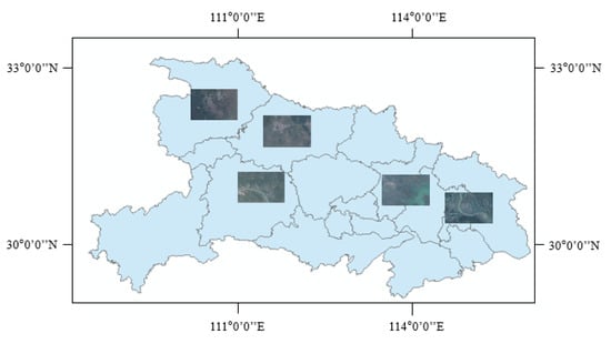 Another large ground object fusion dataset used in this paper named WHU-OPT-SAR [61] contains medium-resolution optical and SAR images. This dataset, with a resolution of 5 m, covers 51,448.56 square kilometers in Hubei Province, including 100 pairs of 5556 × 3704 (pixel) images. The exact location and coverage of these images on the map are shown in Figure 7. The optical images in the dataset were obtained from the GF-1 satellite (2 m resolution), while the SAR images were obtained from the GF-3 satellite (5 m resolution), and a unified resolution of 5 m was achieved through bilinear interpolation. Some samples of this dataset are shown in Figure 8.