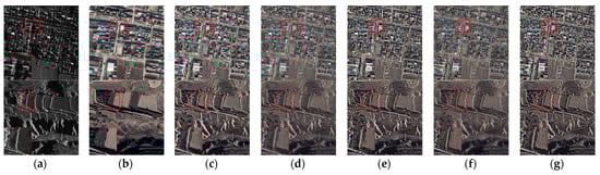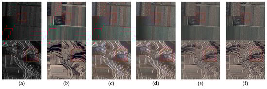 The fusion results of all fusion methods under the same image are shown in Figure 13, and the enlarged image of the selected area is displayed in the upper left corner. From the perspective of visual effect, the fusion results of different types of fusion methods are obviously different. CS methods take the SAR image as a component to participate in inverse transformation and effectively use the pixel intensity information of the SAR image. Compared with other fusion methods, CS methods combine more SAR image information, thus introducing more SAR image texture features and shadows. From the box selection area, it can also be seen that the image texture features and shadows are more similar to the SAR image. MSD methods have advantages in preserving the spectral information of optical images by combining the separated low-frequency components. At the same time, the high-frequency component is selected through specific fusion rules, and the bright and edge features of the SAR image are fused into the fusion result effectively, while the shadows are filtered. Among them, LP, DWT, and DTCWT combine more SAR image information and introduce brighter edge features and noise information in the SAR image, while the color transition is not natural, such as the roads in the figure. GTF can retain spectral information better, but the boundary of ground objects is fuzzy.
