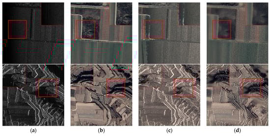 Fusion results of different model-based methods: (a) SAR. (b) Optical. (c) SR. (d) GTF. A larger version of the red square is shown in the corner.