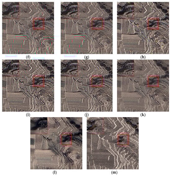 Fusion results of different methods for the high-resolution images: (a) SAR. (b) Optical. (c) IHS. (d) PCA. (e) GS. (f) GP. (g) NSCT. (h) LP. (i) DWT. (j) DTCWT. (k) CVT. (l) SR. (m) GTF. A larger version of the red square is shown in the upper left corner.
