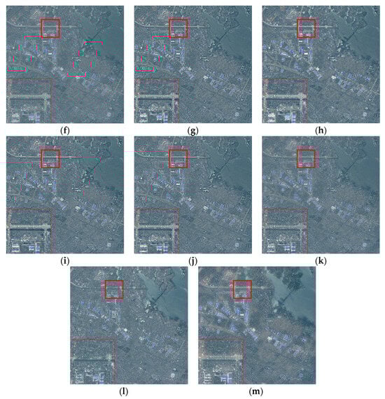 Fusion results of different methods for the medium-resolution images: (a) SAR. (b) Optical. (c) IHS. (d) PCA. (e) GS. (f) GP. (g) NSCT. (h) LP. (i) DWT. (j) DTCWT. (k) CVT. (l) SR. (m) GTF. A larger version of the red square is shown in the lower left corner.