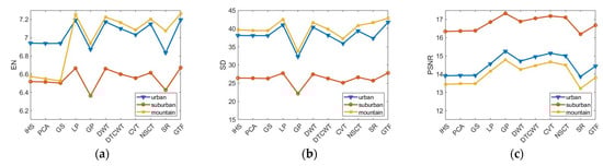 As mentioned above, the performance of the same fusion method can exhibit significant variations across different scenes owing to the special imaging mechanism of SAR and its distinct image content. The fusion quality is affected not only by the quality of the input image, but also by the performance of the fusion method. Accordingly, it is worth considering the selection of a suitable method among many fusion methods and the choice of appropriate metrics for evaluation. In order to compare the performance of various fusion methods objectively, some researchers quantitatively evaluate the effect of fusion methods through objective fusion quality evaluation metrics [6,7,8,9], but there are few fusion methods and evaluation metrics involved in experiments, which fail to cover all of the categories of pixel-level fusion methods.