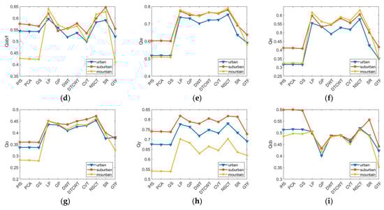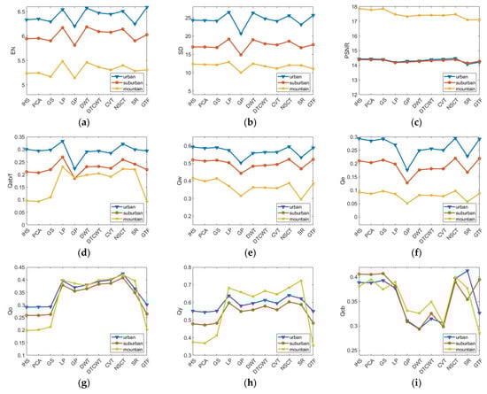 The objective quality evaluation of image fusion can be carried out in two ways [48]. The first way is to compare the fusion results with a reference image, which is commonly used in pan-sharpening and multi-focus image fusion. However, in multimodal image fusion tasks, such as SAR–optical image fusion, obtaining an ideal reference image is challenging. Therefore, this paper uses the non-reference metrics to objectively evaluate the quality of the fusion image. The fusion results are comprehensively compared from different aspects through nine representative fusion evaluation metrics: information entropy (EN), peak signal-to-noise ratio (PSNR), mutual information (MI), standard deviation (SD), the metric based on edge information preservation [49], the universal image quality index [50], the weighted fusion quality index , the edge-dependent fusion quality index , the similarity-based image fusion quality index , and the human visual system (HVS)-model-based quality index [51]. Based on the different emphases of these evaluation indexes, they can be divided into four categories [52,53]. Table 4 presents the definitions and characteristics of the selected nine quality metrics.
