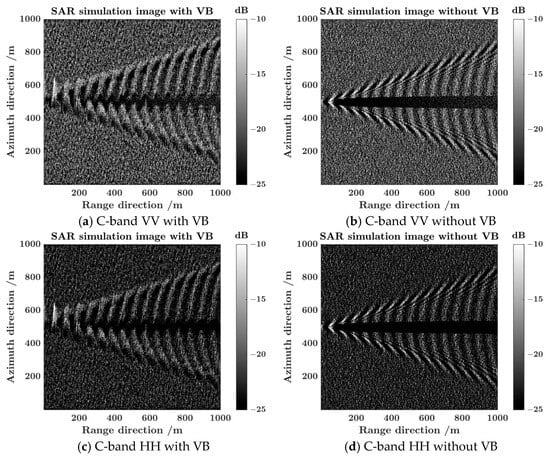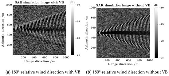 The SAR simulation results of ocean ship wakes with different relative wind directions are presented in Figure 10. The wind speed is 5 m/s, the center incidence angle is 40°, and the ship speed is 10 m/s. The imaging waveband is the C band with VV polarization. The relative radar looking direction is fixed as 180°. The two images of the left column in Figure 10 are the results that consider the VB effect, while those in the right column do not consider the effect. Our parameters are set as follows to discuss the imaging results under different relative wind directions: in the simulation results of the first and second rows in Figure 10, the relative wind directions are set as 180 and 135°, respectively.
