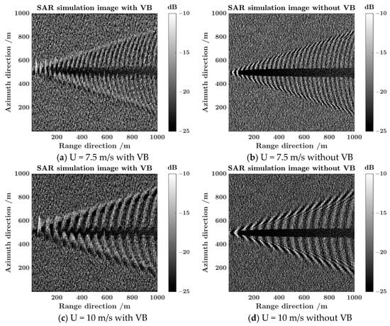 When the VB effect is not considered, with an increase in the wind speed, the visualization of the ship wake’s signature in the SAR image becomes more difficult in Figure 6b,d,f. As can be observed, the scale of ambient wind waves progressively increases from Figure 6b–f. In the ship wake region, the results with a U10 of 7.5 m/s in Figure 6d and with a U10 of 10 m/s in Figure 6f only display divergent waves and turbulent wake. It is noteworthy that the divergent waves in Figure 6f appear blurrier than those in Figure 6d. This is due to the influence of an increased wave height, which disturbs the textures of Kelvin transverse waves and divergent waves, as seen in the SAR simulation results of the ocean Kelvin wake shown in [25]. In Figure 6b,d,f, the turbulent wakes progressively become brighter because, as the wind speed increases, the small-scale waves in the turbulent wake region regenerate more rapidly.