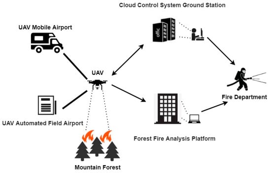 A UAV takes off and lands via a UAV Mobile Airport or a UAV Automated Field Airport. Initially, the UAV conducts inspections of the forest following predetermined routes, collecting image and video data of the mountainous terrain. Subsequently, the UAV transmits the data to the Forest fire Analysis Platform, maintaining a continuous interaction with the Cloud Control System Ground Station throughout the entire process. Ground station personnel can monitor real-time images of the mountains and forests via the onboard camera and issue control instructions to the UAV. The Forest fire Analysis Platform then processes and analyzes the captured images. If smoke is detected, the Forest fire Analysis Platform sends an alert to the Fire Department. Additionally, ground station personnel can promptly provide fire-related information to the Fire Department as needed.