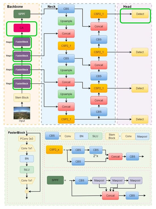 The improved YOLOv5s architecture we propose is illustrated in Figure 2, and the changes are framed by the solid green line. It comprises three primary components: the backbone, the neck, and the prediction heads. The backbone network consists of FasterBlock modules, designed based on partial convolution (PConv) that offers rapid memory access capabilities. Additionally, we integrated a CA module at the end of the backbone, effectively focusing the model’s attention on the foreground smoke targets and distinguishing them from the background to further enhance feature extraction. Lastly, the model utilizes four prediction heads, incorporating an additional small object detection head and a large feature map to reinforce feature extraction for small-scale targets. This integration enables the model to establish long-range dependencies and capture global contextual information within the input image, allowing for an improved understanding of the semantic and spatial relationships of objects, thus providing powerful foreground-background distinction and small-scale smoke recognition capabilities.