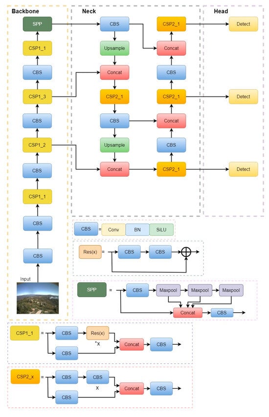 Our proposed methodology builds upon the YOLOv5s model, a widely-utilized framework for object detection. Figure 3 provides an overview of the YOLOv5 architecture, which can be delineated into three primary components: the backbone network for extracting features, the neck network for fusing features, and the head network for detecting the class and location of the target through regression. The YOLOv5 architecture is characterized by its straightforwardness and efficiency.