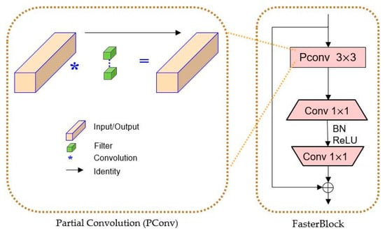 In the original YOLOv5’s backbone network, the utilization of conventional convolutional CBS modules leads to a considerable redundancy in the intermediate feature map computation, resulting in increased computational costs. To address this, we introduced the FasterBlock module, drawing inspiration from the concept of FasterNet [], to serve as the backbone network for extracting features from UAV images. We employed the innovative technique of partial convolution (PConv), which enables a more efficient extraction of spatial features by reducing redundant computations and memory access simultaneously.