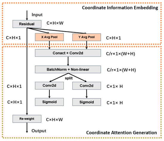 Ultimately, the output of the feature , which represents the height and width of input X on the c-th channel is and , after the coordinate attention module, can be expressed as Equation (10).